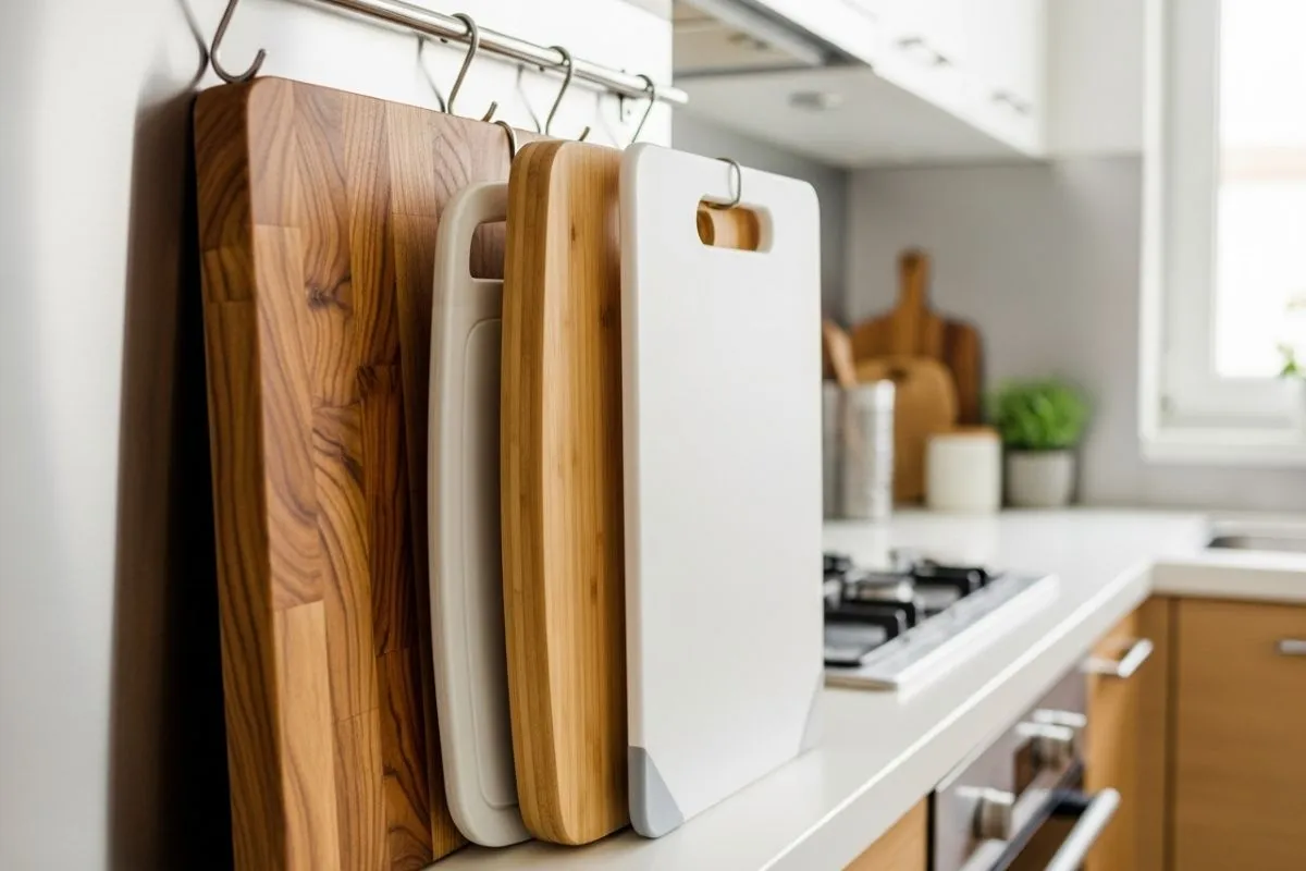 In smaller kitchens, vertical solutions work best. Wall-mounted racks or magnetic strips keep boards off the counter while allowing airflow, which is especially important for wood and bamboo boards that need ventilation to stay dry. Countertop vertical organizers with drip trays are another practical choice for households using multiple boards, keeping them upright and separated while preventing water from pooling. For those who want built-in convenience, pull-out drawers with airflow slats offer a modern option that combines storage and ventilation.